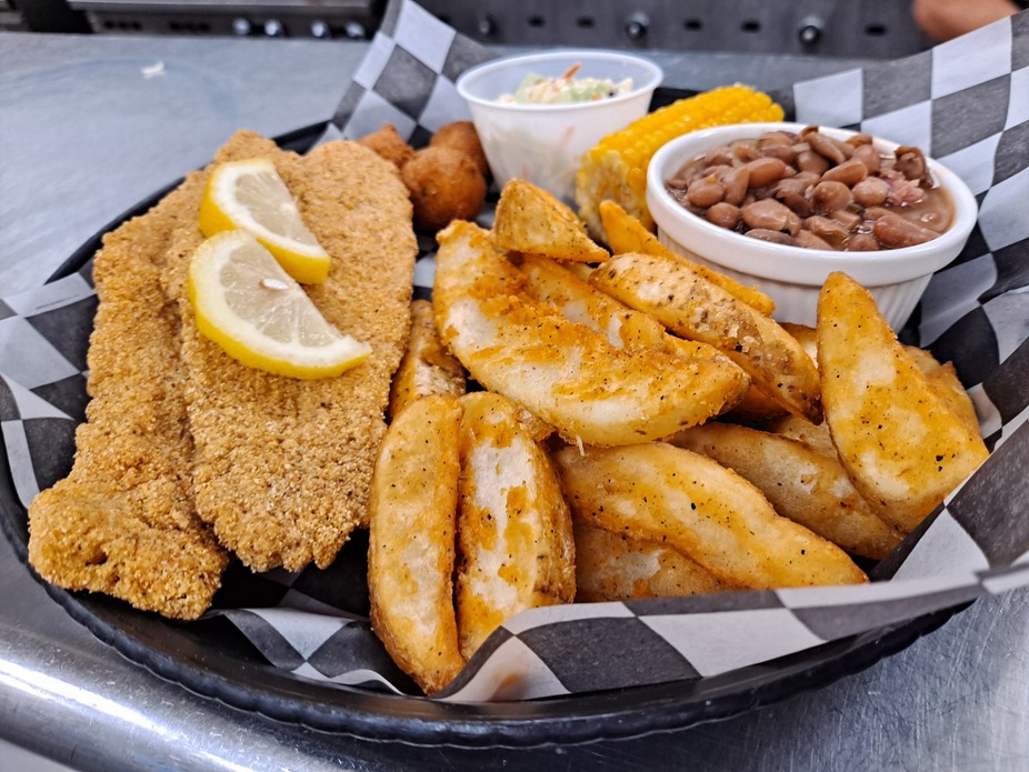 All you can eat hand-battered Catfish served with potato wedges, Southern spicy beans, corn on a cob, coleslaw and homemade hushpuppies!